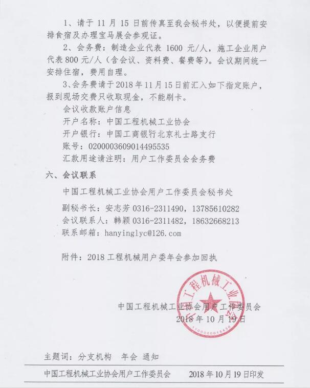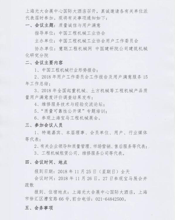 ? ?根據用戶關注產品質量可靠性、耐用性等熱點,研討質量信譽等級評價體系建設,開展質量可靠性培訓公開課,發布第三方用戶滿意評價結果。經研究決定,2018年中國工程機械工業協會用戶工作委員會年會于2018年11月26日在上海光大會展中心國際大酒店召開,真誠邀請各有關單位派代表屆時參加。現將有關事項通知如下: